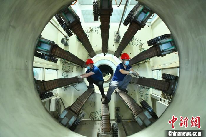 图为河北省大厂回族自治县一家公司,工作人员在组装缸体回转机设备。 刘亮 摄